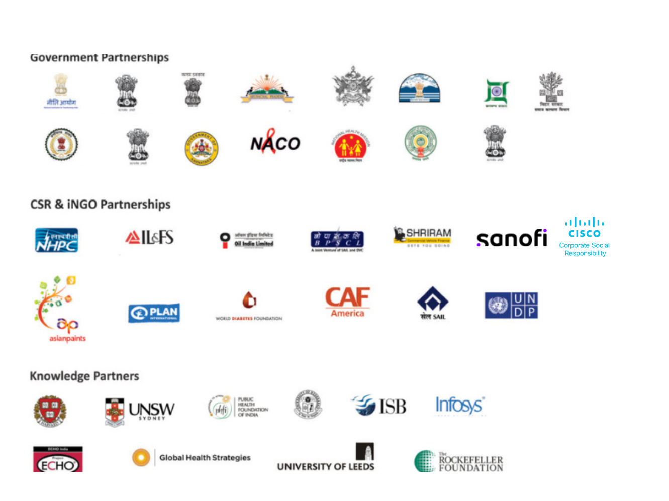 We deliver health at scale through co-creation and collaboration with public and private stakeholders. From government bodies like NITI Aayog (e.g. Aspirational Districts & SATH programmes) to UNDP, Bill & Melinda Gates Foundation, corporate CSR partners (Sanofi, Asian Paints, Shriram Finance), and technical experts, we build sustainable public-health frameworks, digital tools (e.g. AMRIT), and mobile outreach to reach the last mile.